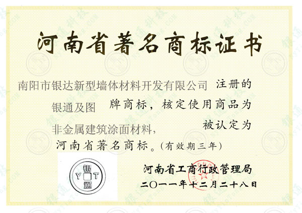 注: 此證書有效期三年,目前已失效,本介紹頁僅為方便用戶了解企業歷史資質,望悉知 河南省著名商標證書 南陽市銀達新型墻體材料開發有限公司 注冊的銀通及圖(銀通·YT)牌商標,核定使用商品為非金屬建筑涂面材料,被認定為河南省著名商標。(有效期三年) 河南省工商行政管理局 二〇一一年十二月二十八日