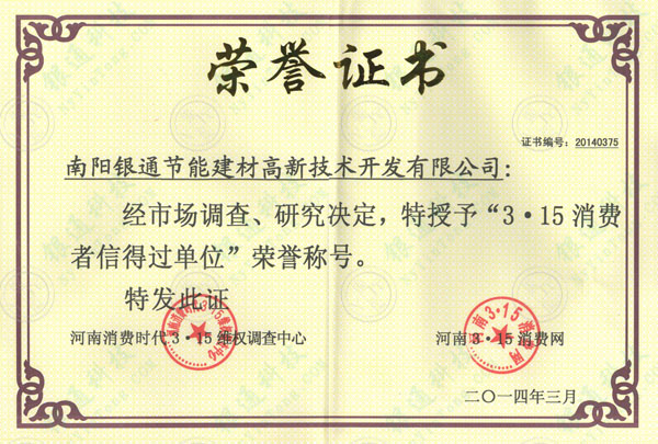 2014年3·15消費(fèi)者信得過單位榮譽(yù)證書