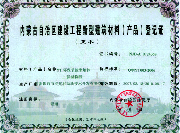 內(nèi)蒙古省建筑節(jié)能產(chǎn)品核準(zhǔn)證書 有效期限:2007.08.18-2010.08.17
